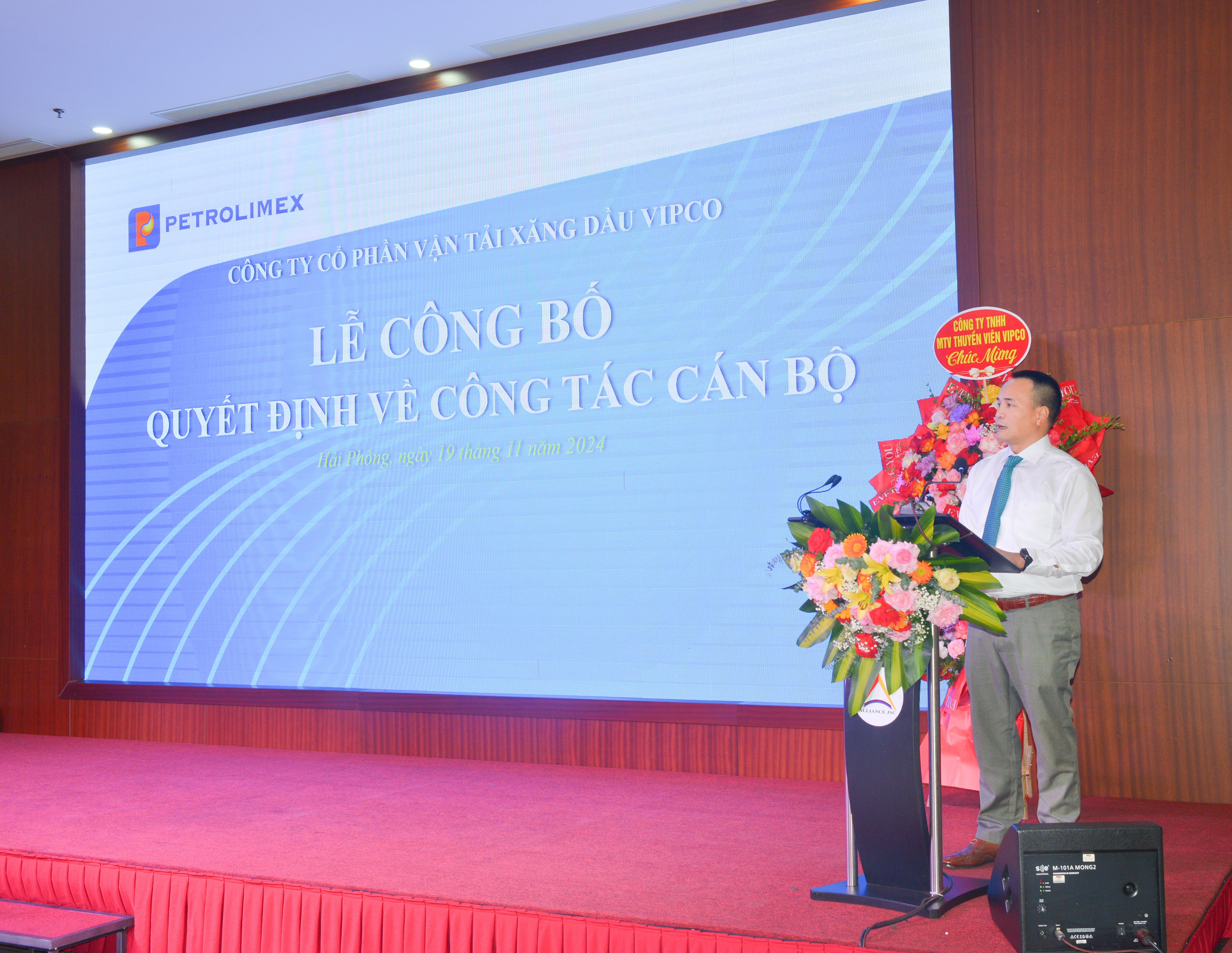 Sáng ngày 19/11/2024, tại Hội trường Tòa nhà Hàng hải Liên Minh - Số 802 đường Lê Hồng Phong, phường Thành Tô, quận Hải An, Tp. Hải phòng Công ty Cổ phần Vận tải Xăng dầu VIPCO (mã CK VIP) đã tổ chức lễ công bố quyết định bổ nhiệm Tổng giám đốc Công ty cho Ông Nguyễn Quang Minh - nguyên Phó Tổng giám đốc Công ty.